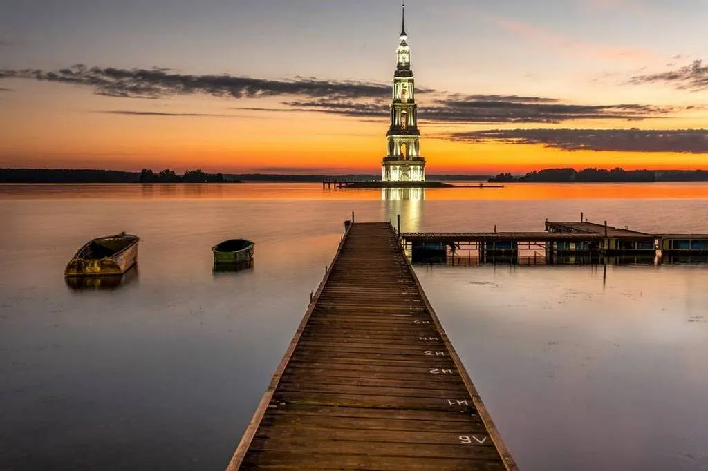 Калязин — слобода при Троицком (Макарьевском) монастыре, известная с XII в. и получившая имя владельца этих мест Ивана Каляги. Статус города обрела в XVIII в. Калязин был городом преуспевающих купцов и ремесленников, известный своими цветными изразцами и кружевами. В 40-х годах XX в. значительная часть города была затоплена при сооружении Угличского водохранилища. Символ нынешнего Калязина — изящная колокольня Никольского собора (1800 г.). Раньше собор находился на главной городской площади, а теперь лишь колокольня одиноко возвышается над гладью водохранилища и являет собой уникальное и трогательное зрелище.
