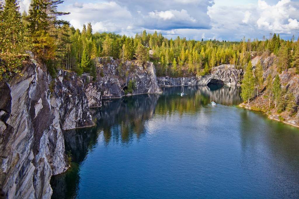 От причала в п. Хийденсельга гости на комфортабельных автобусах отправляются в пос. Рускеала, где с XVIII в. действуют наиболее крупные и знаменитые мраморные ломки Карелии. Поселок Рускеала расположен в 30 км севернее г. Сортавала, в 20 км от государственной границы с Финляндией. В пути гости знакомятся с историей этой живописной местности, освоенной еще во времена походов викингов.